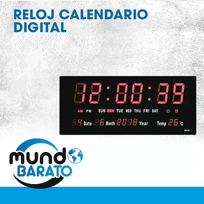 Reloj digital moderno de pared grande con calendario y termómetro.