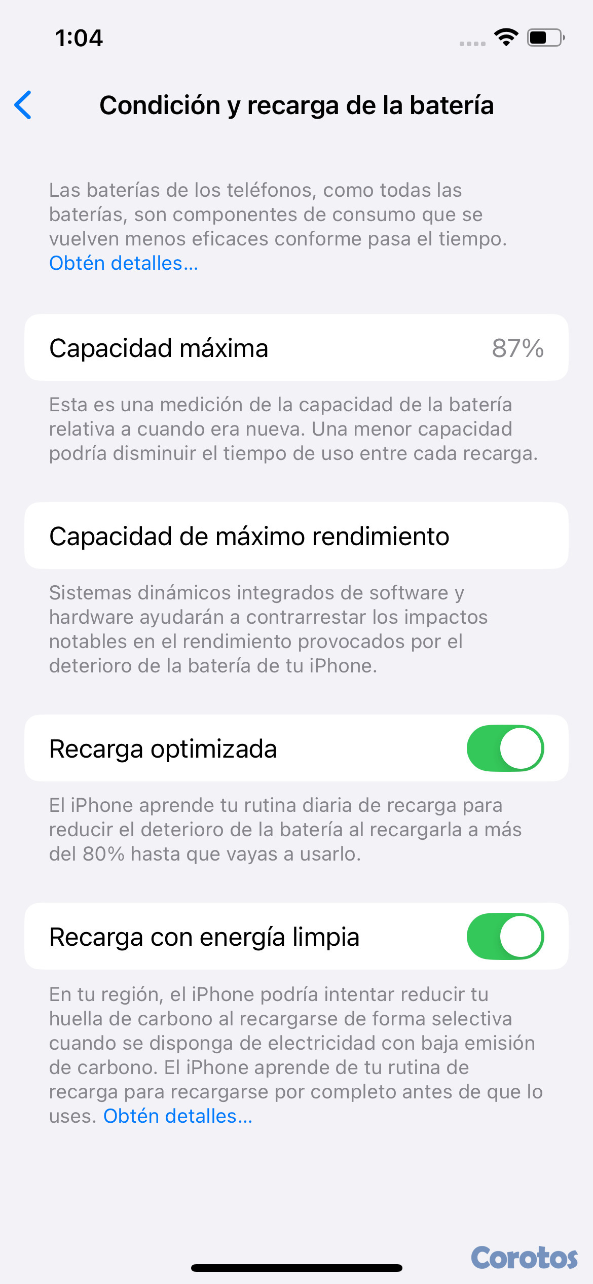 87% de capacidad máxima de la batería