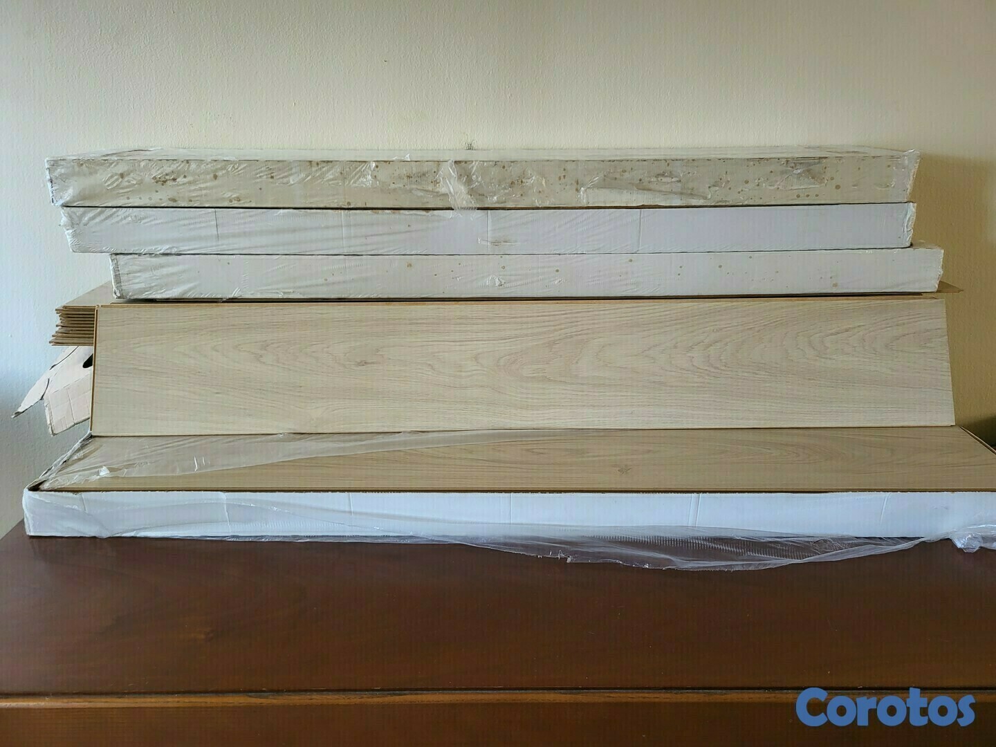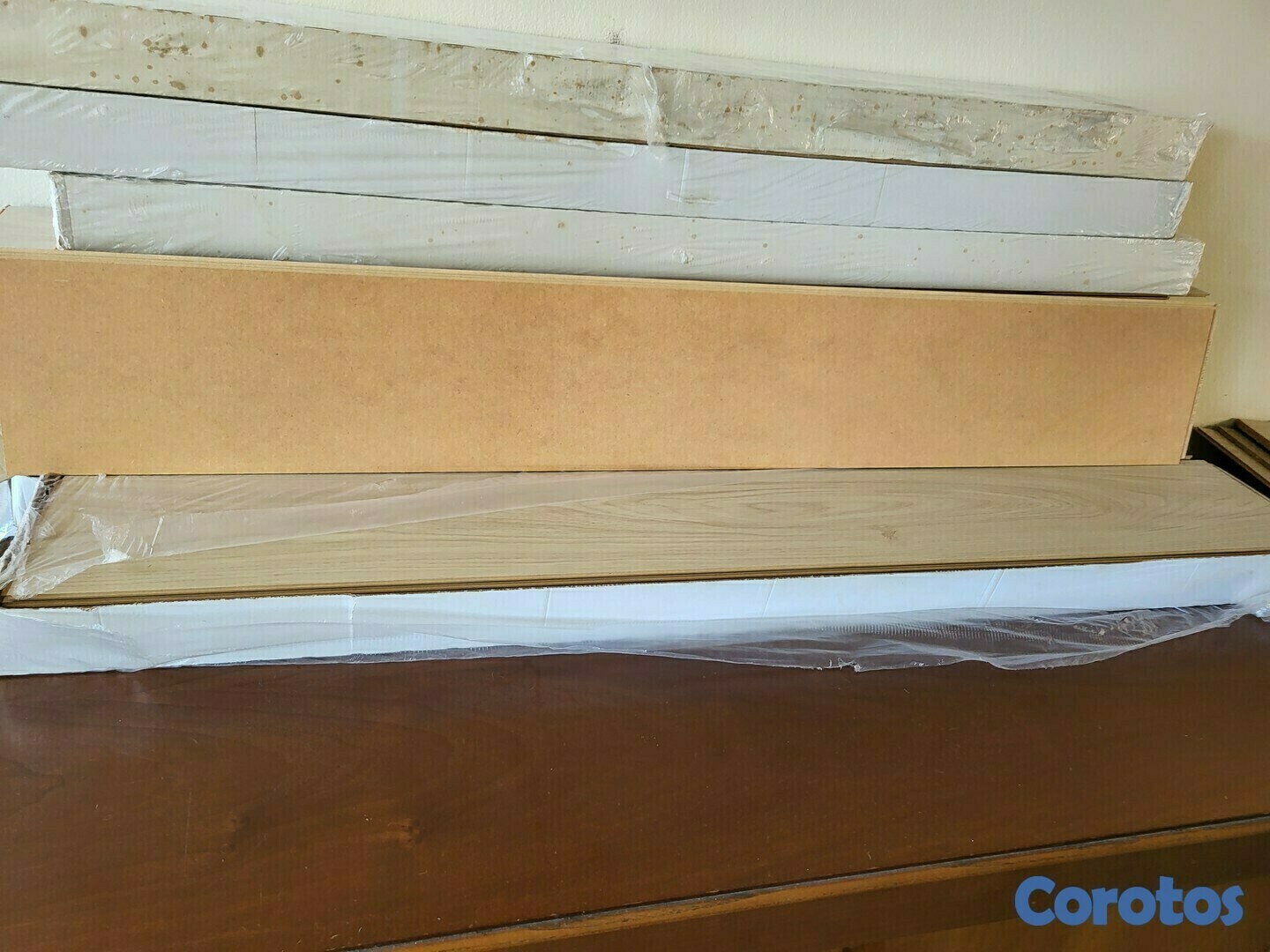El laminado es de madera de fácil instalación, las tablas son macho y hembra, cuesta 1300 pesos cada una y son 15 paquetes, 42 mq2. Se vende por unidad a 1.100 pesos o los 15 paquetes por 9.700