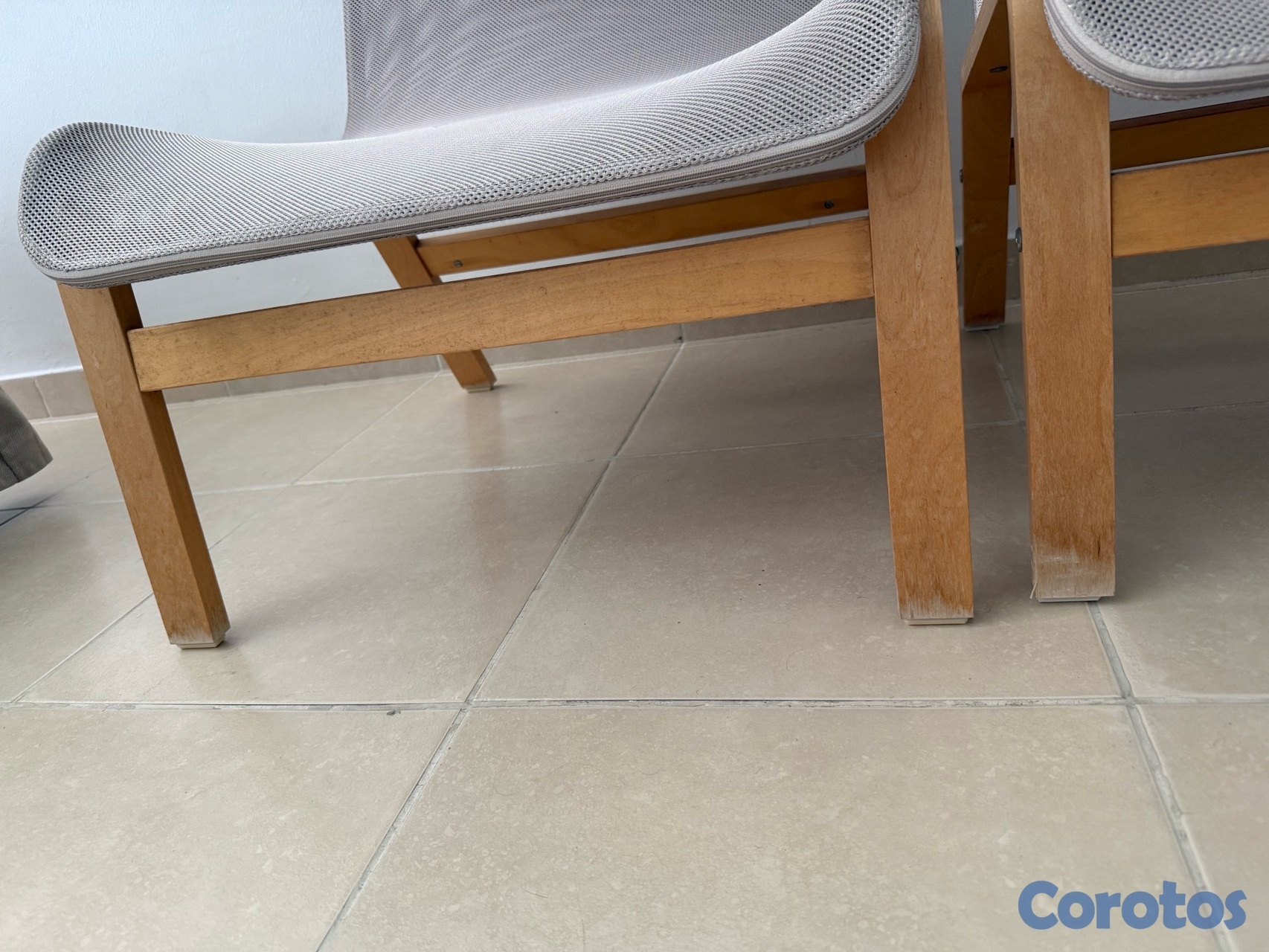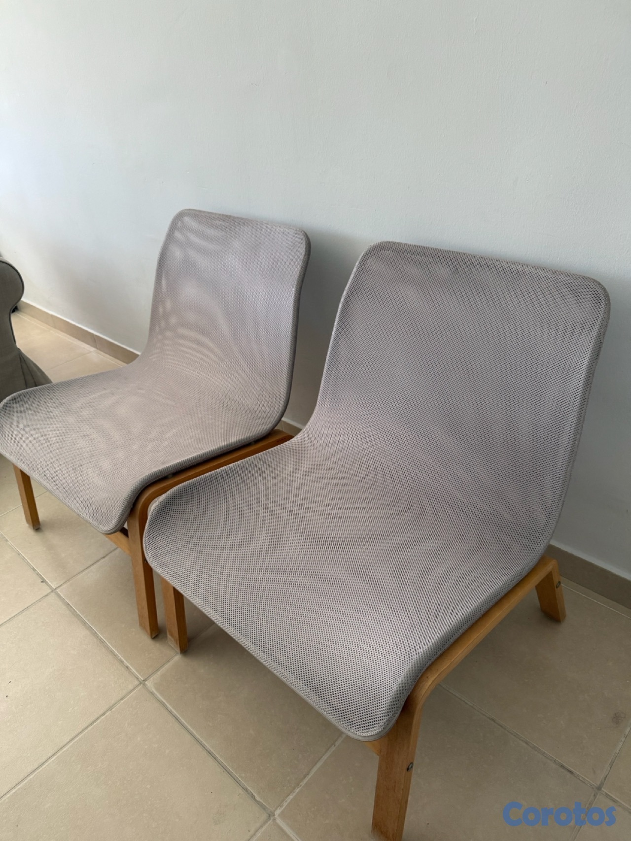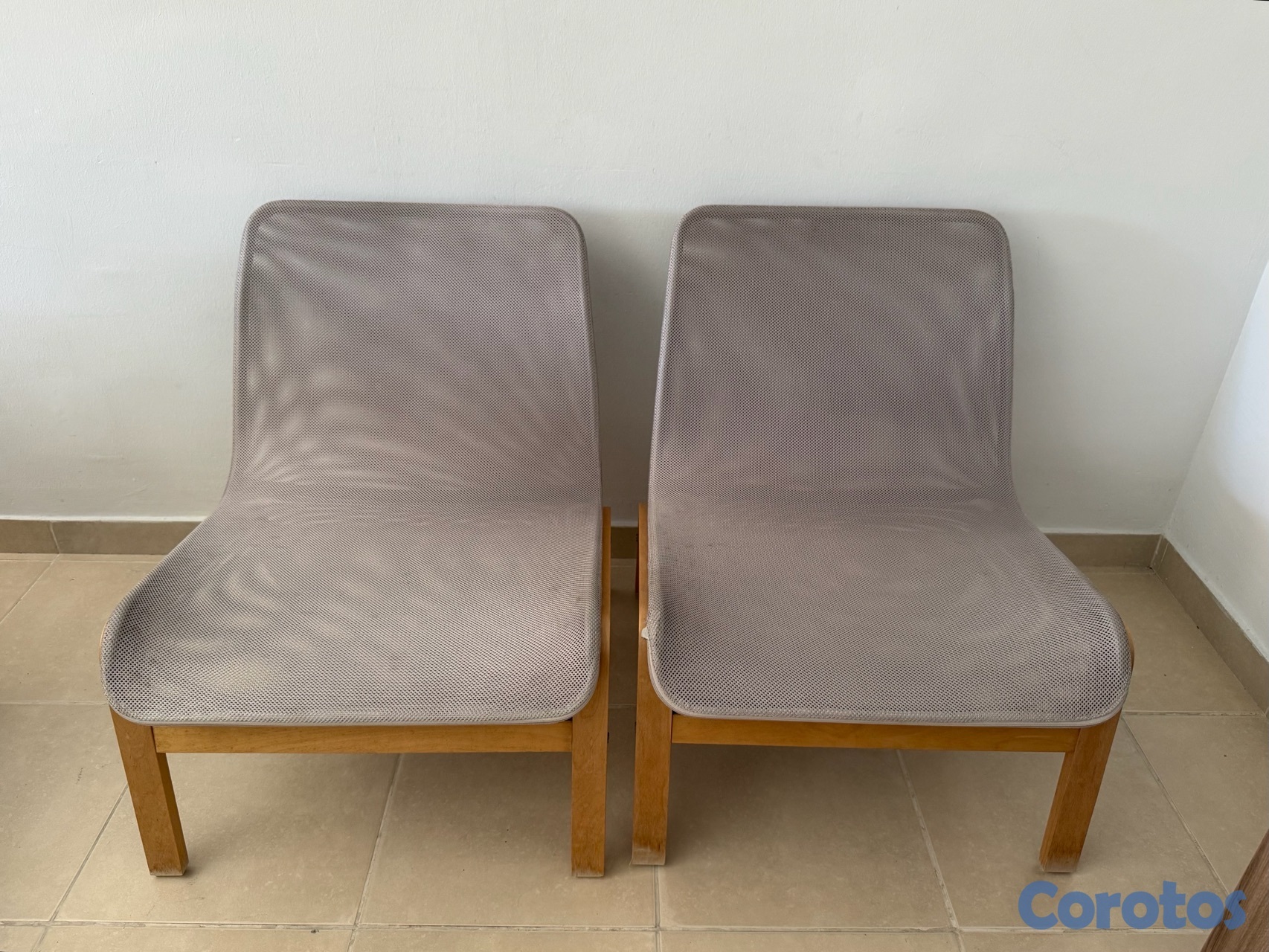 Vendo set de 2 sillas tipo lounge estilo IKEA en madera clara con cojín gris.