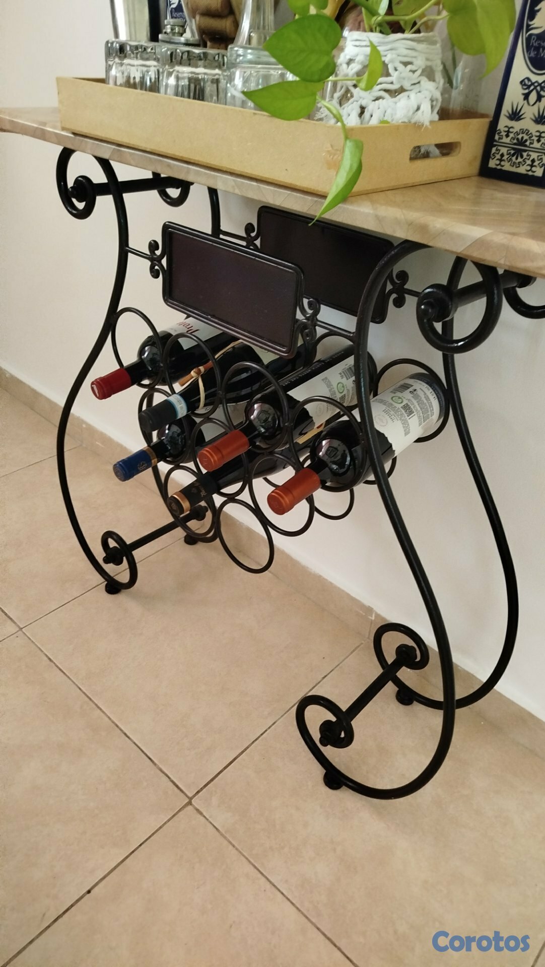 Vendo hermosa vinera en hierro y tope de madera. Caben 9 botellas. ( El tope es de madera, tienen un papel tapiz ahora mismo pero se puede retirar y pintar del color que desee).