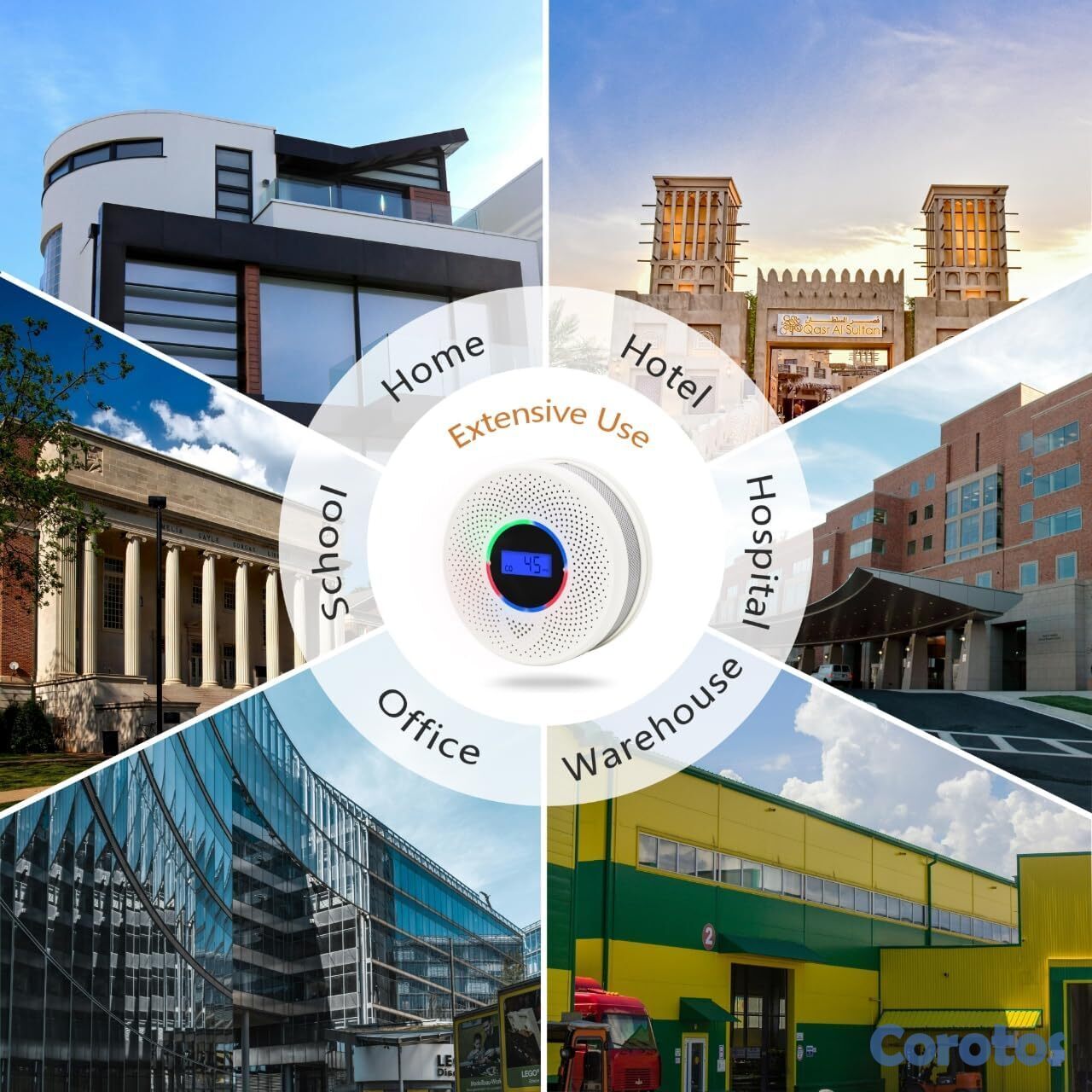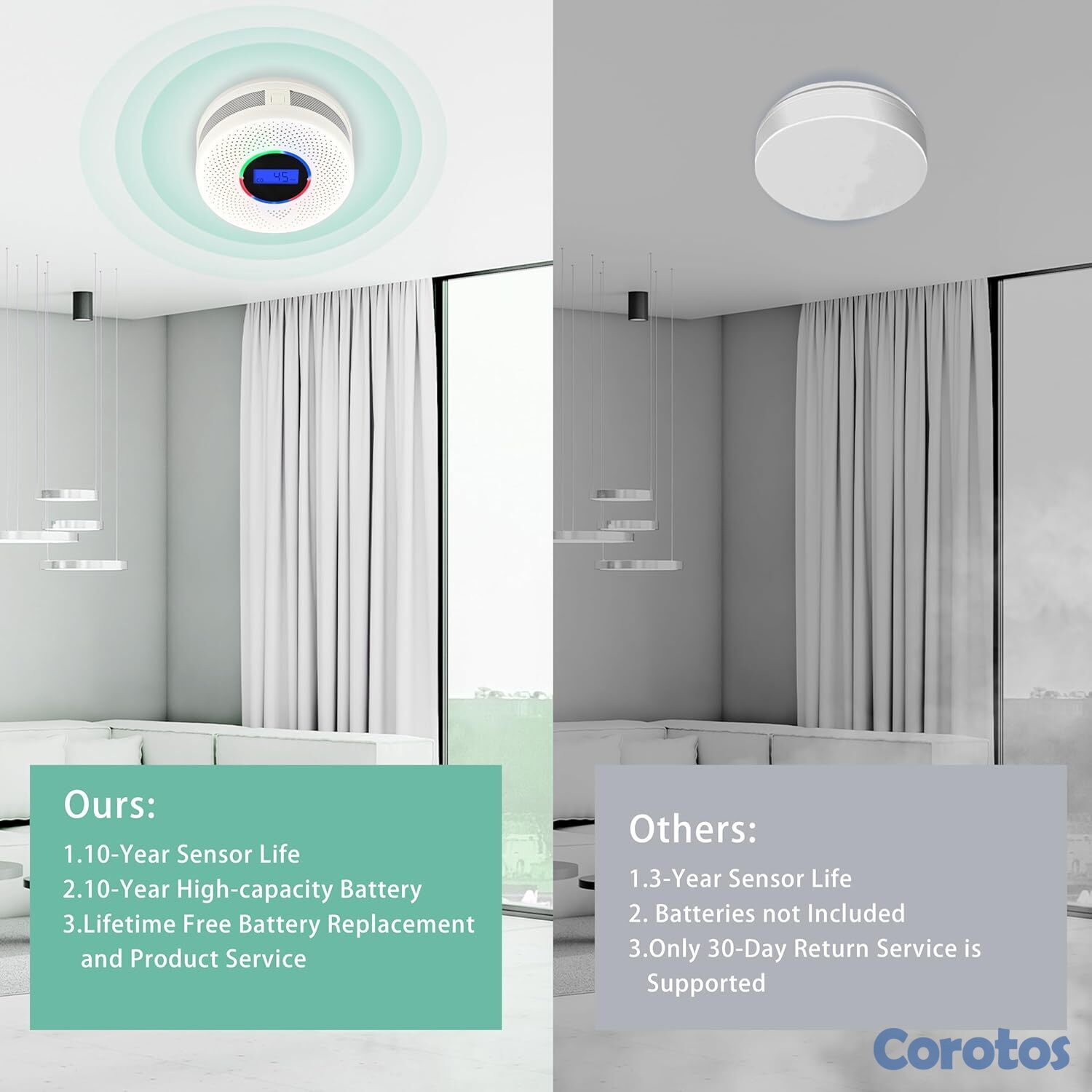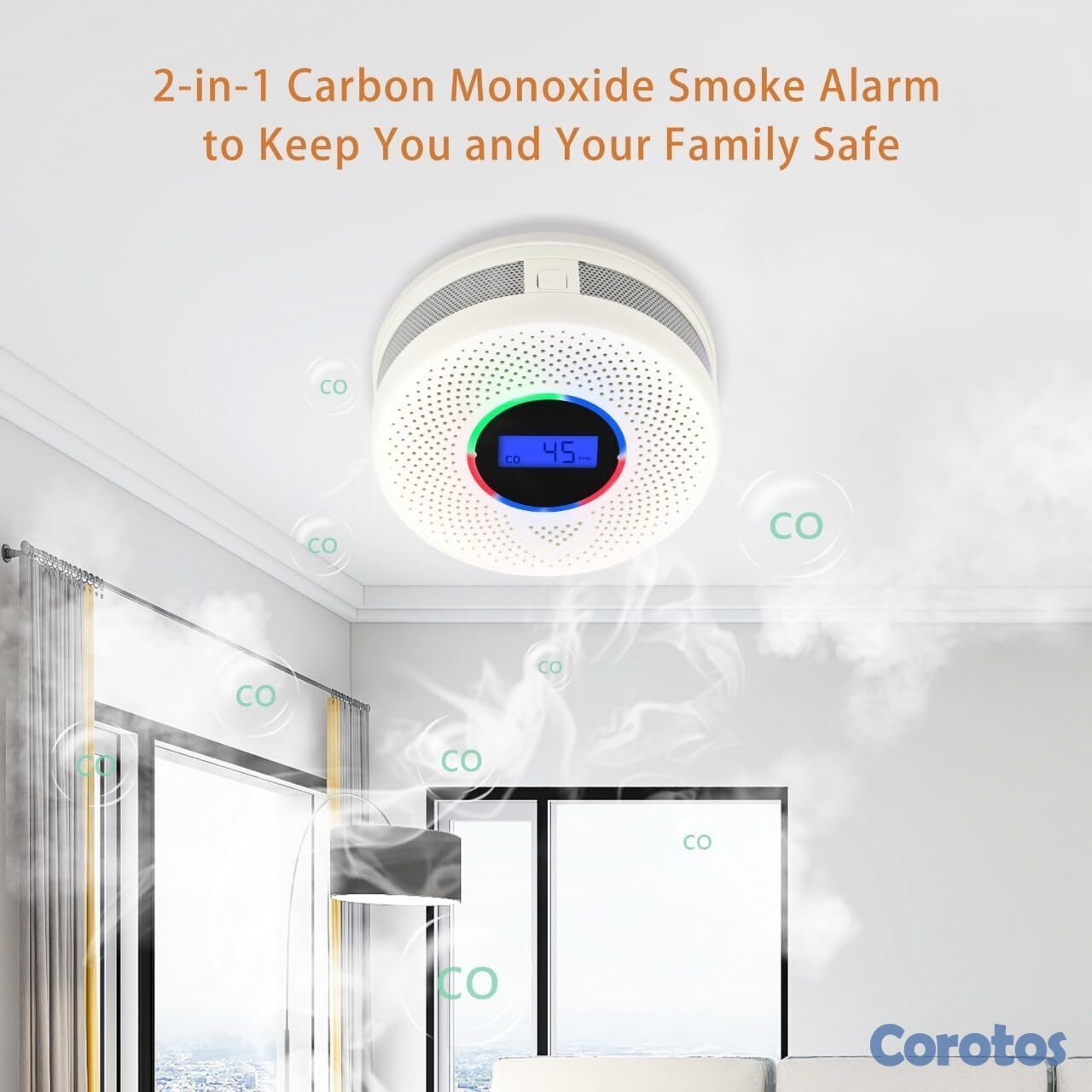 Detector de humo y monóxido de carbono 2 en 1, con sensores avanzados y batería integrada de 10 años de duración. Interconexión inalámbrica para cubrir todo el hogar: cuando una alarma detecta peligro, todas suenan al mismo tiempo. Incluye pantalla digital para visualizar niveles de CO y estado de batería en tiempo real.