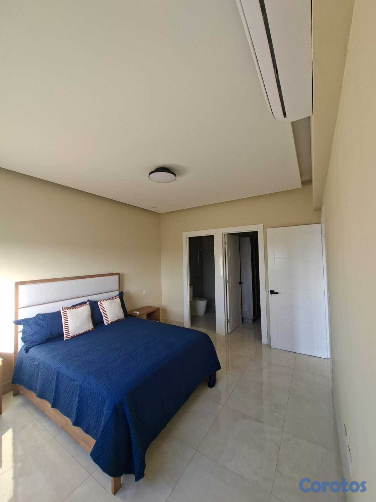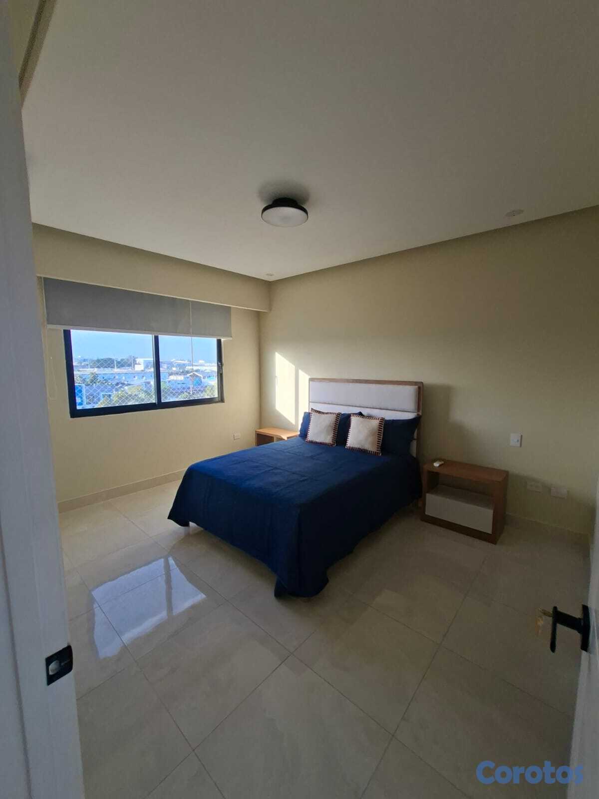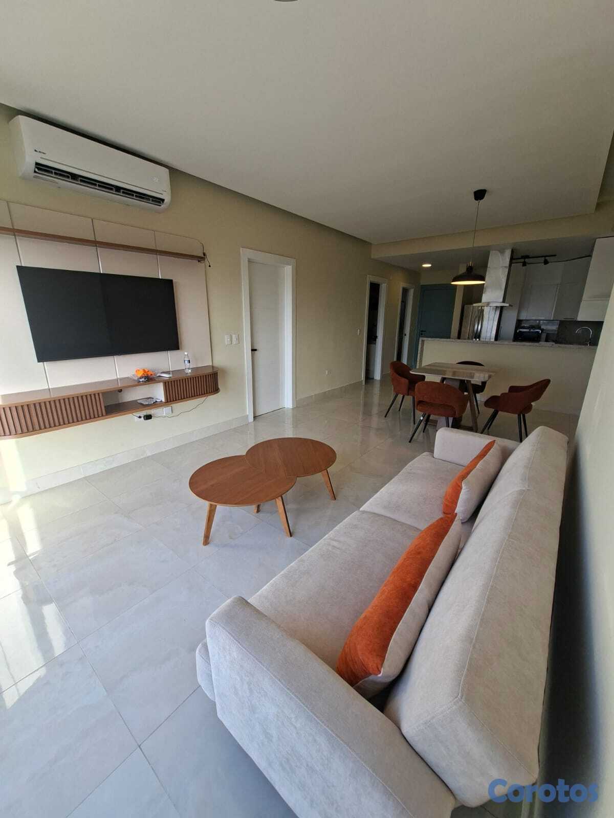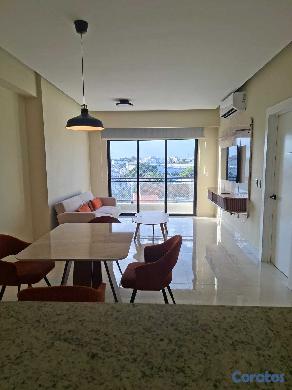 Se alquila apartamento de 1 habitación amueblado en Los Cacicazgos. Cuenta con línea blanca; 2 aires, nevera, estufa, lavaplatos, horno eléctrico, torre de lavadora/secadora, televisión, entre otros detalles. 1 parqueo techado.