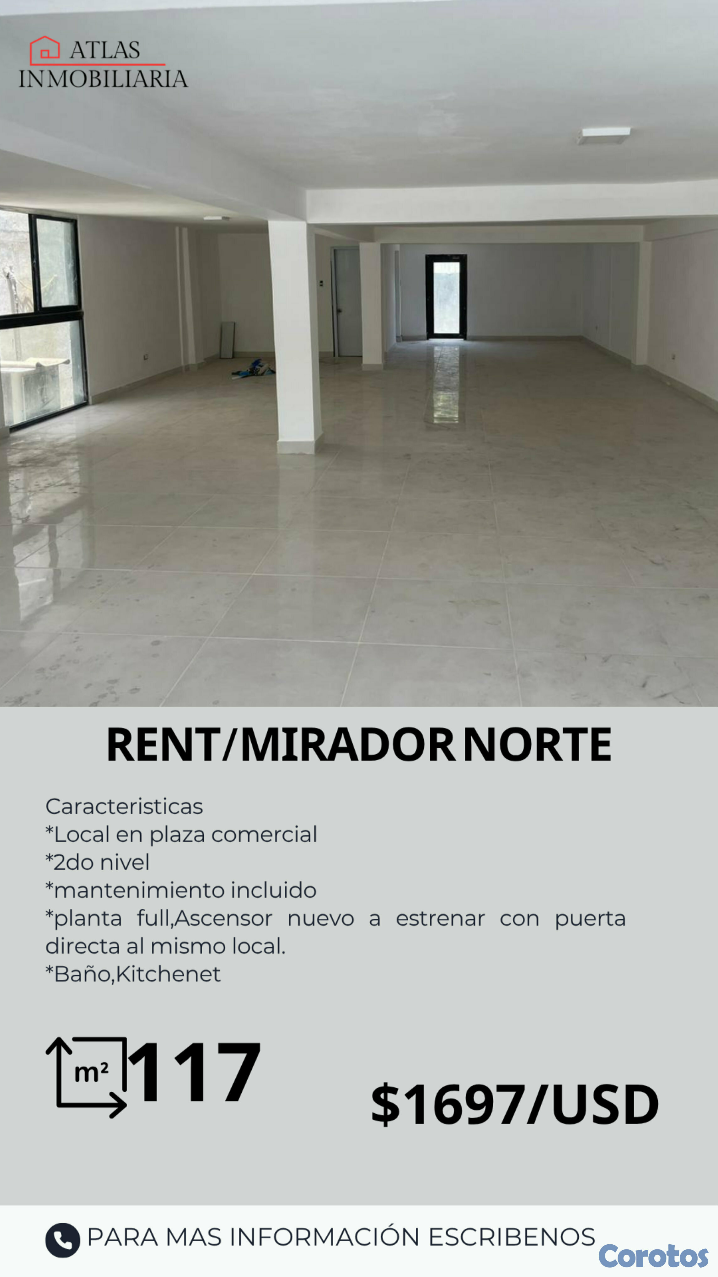 ▪️Local Comercial de Renta, de 117 mt2, en Mirador Norte, Entrada por la Av. 27 de Febrero, segundo nivel, planta full, Ascensor nuevo a estrenar con puerta directa al mismo local, baño, kitchenet, precio de Renta US$1,697.Negociables