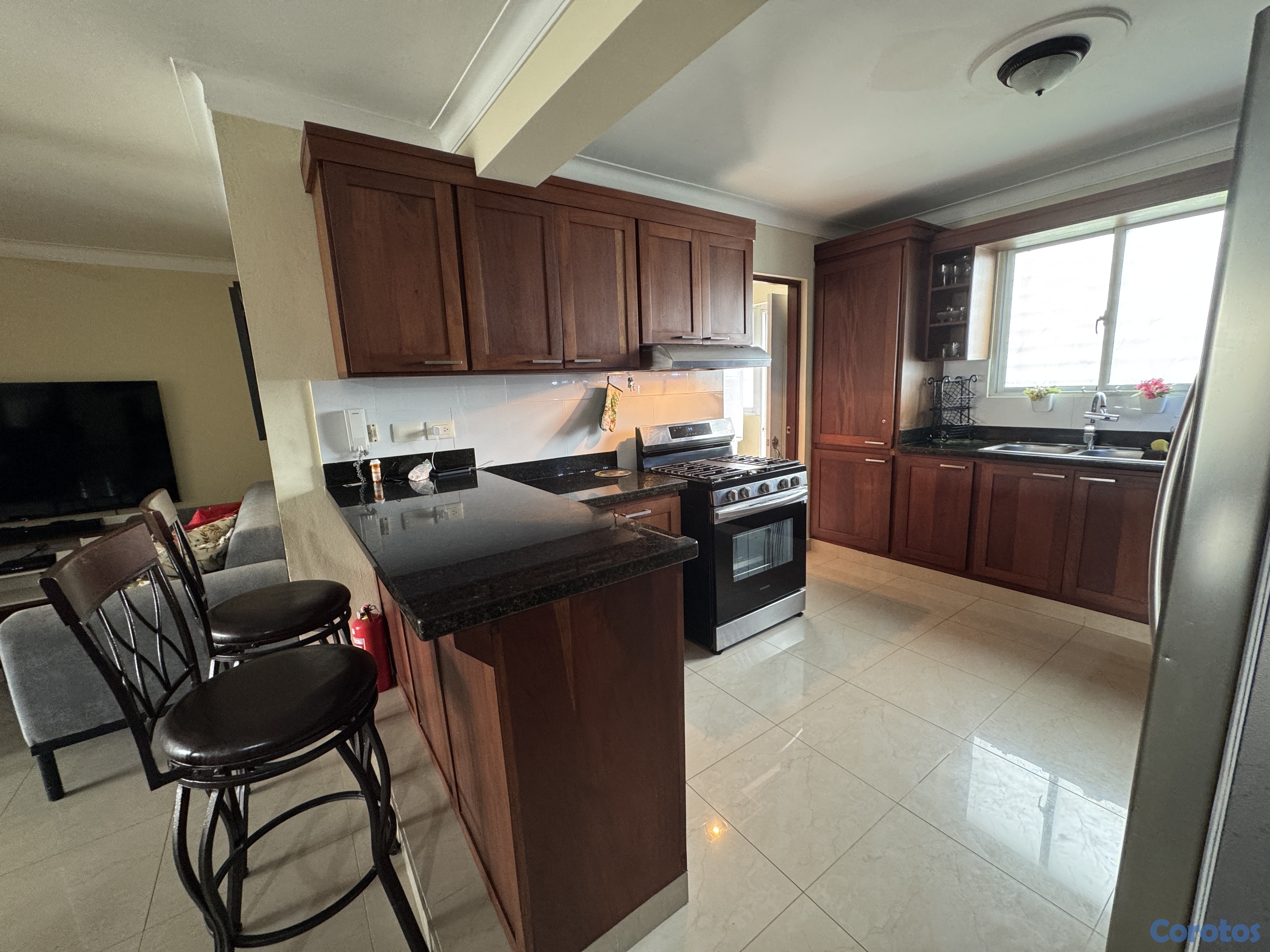 Cocina con desayunador y despensa.
