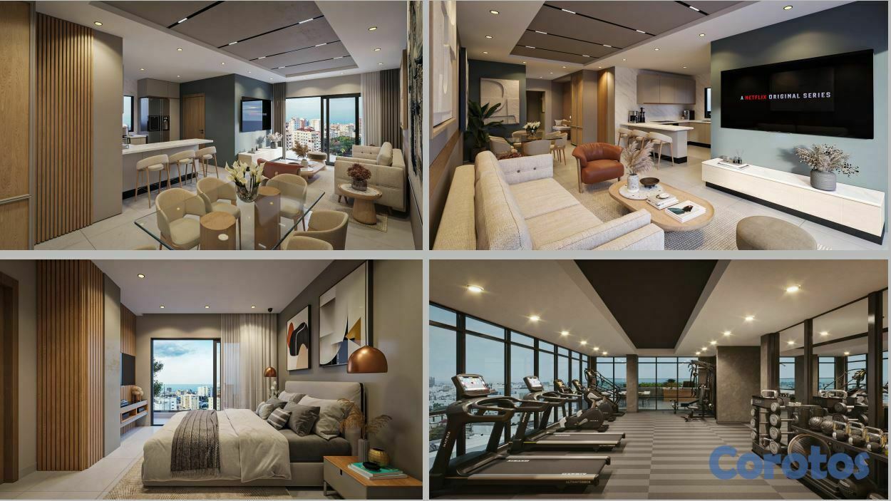 El mismo contará con terminaciones en pisos y zócalos en porcelanato importado, techos en yeso, ventanas corredizas de aluminio p-65 / p-92 y vidrio color evergreen, balcones con baranda de aluminio y vidrio, puertas y marcos en madera preciosa, cocinas modulares de alta calidad con topes de cocina en granito natural, baños con diseño y muebles modernos, herrajes y grifería de alta calidad, preinstalación de acondicionadores de aire.