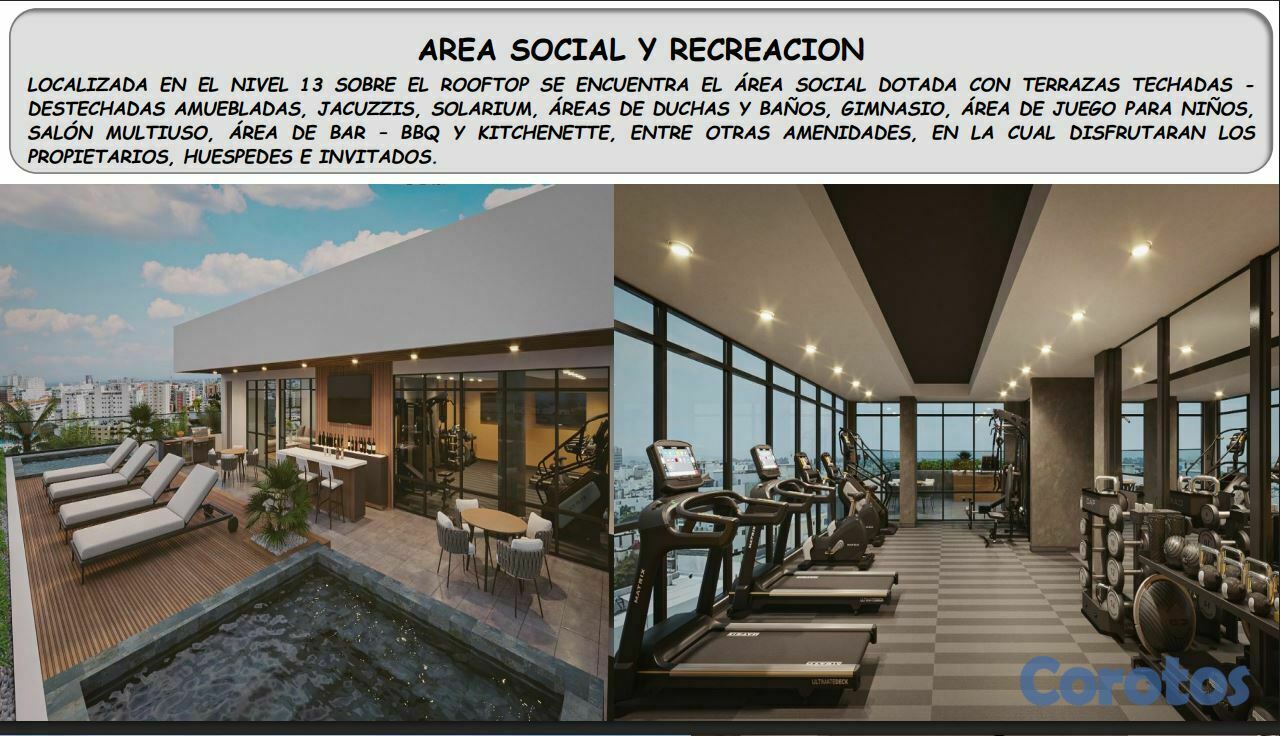 En el nivel 13 se encuentra el rooftop con un área social con terrazas techadas y destechadas amuebladas, jacuzzis, áreas de duchas y baños, gimnasio, área de juego para niños, salón multiuso, área de bar – BBQ, entre otras amenidades.