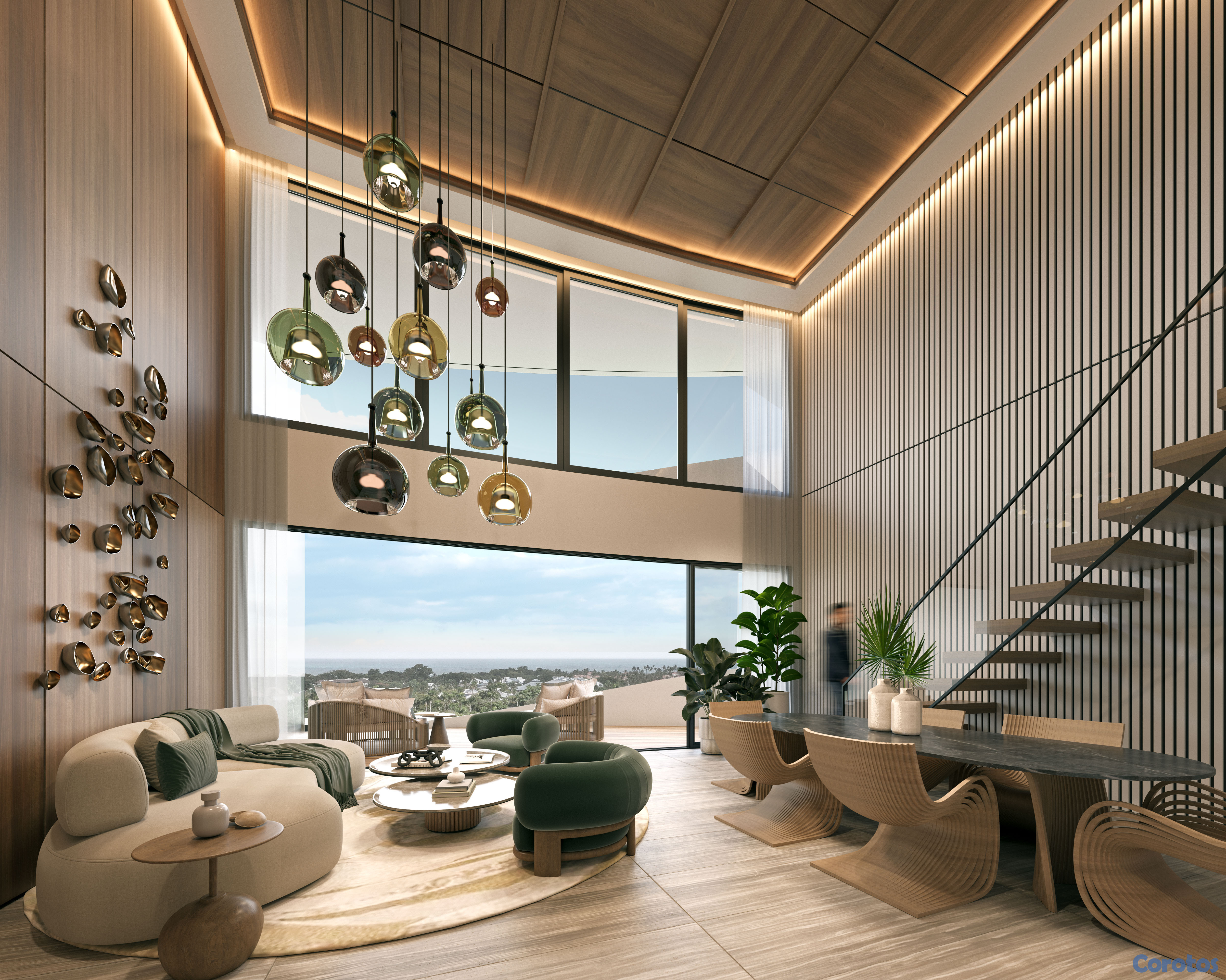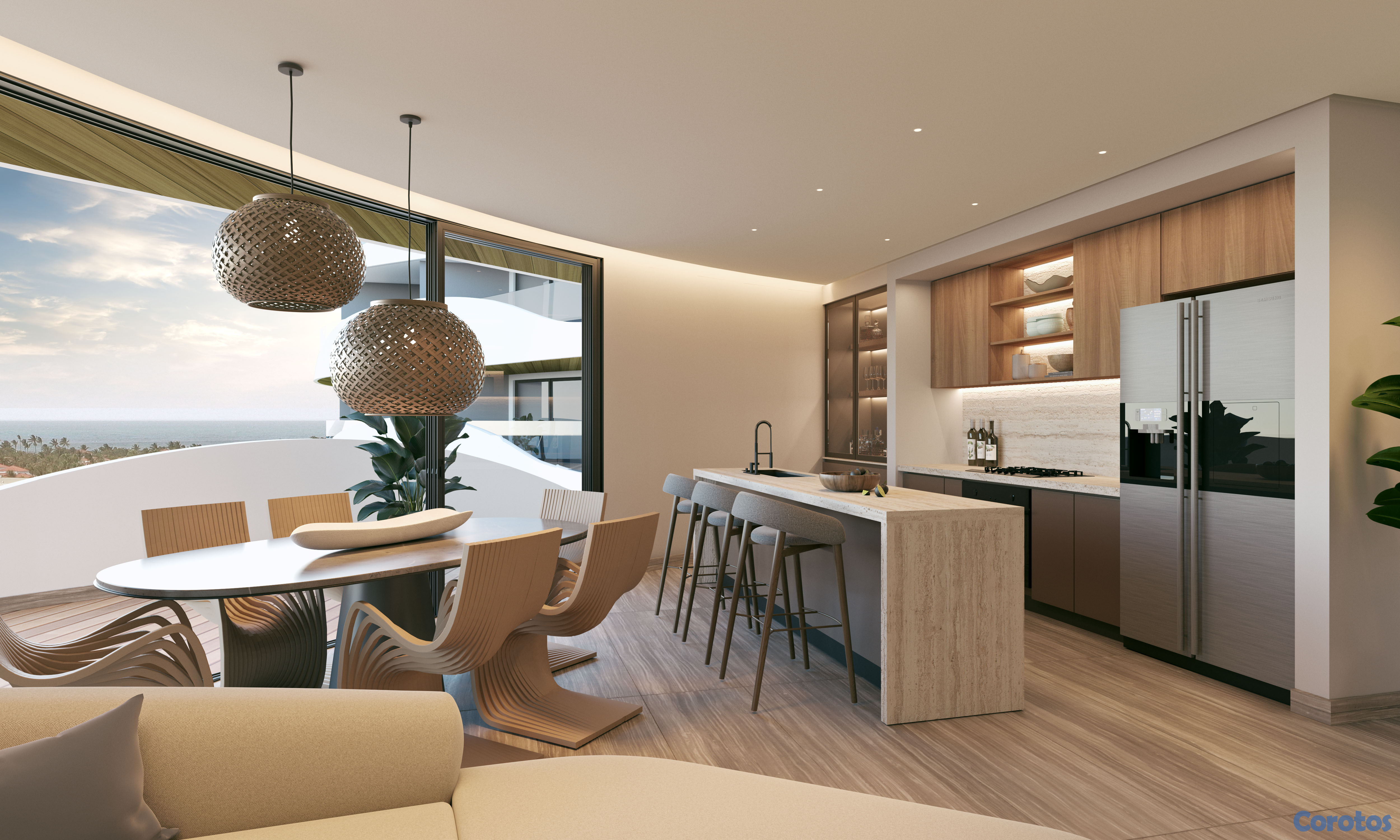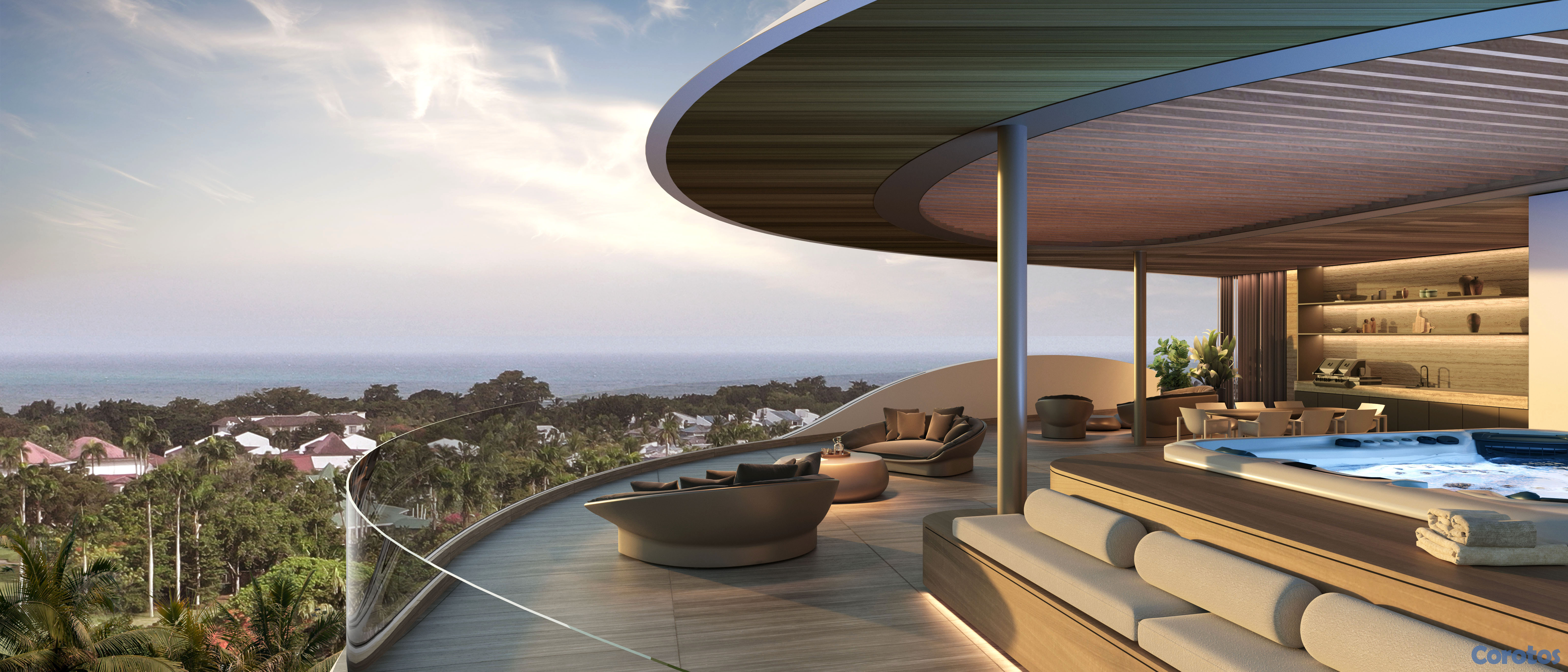 🌀 Cuenta con un diseño arquitectónico de lujo inspirado en el mar, con terrazas curvas, techos de madera sintética y espacios llenos de luz natural.