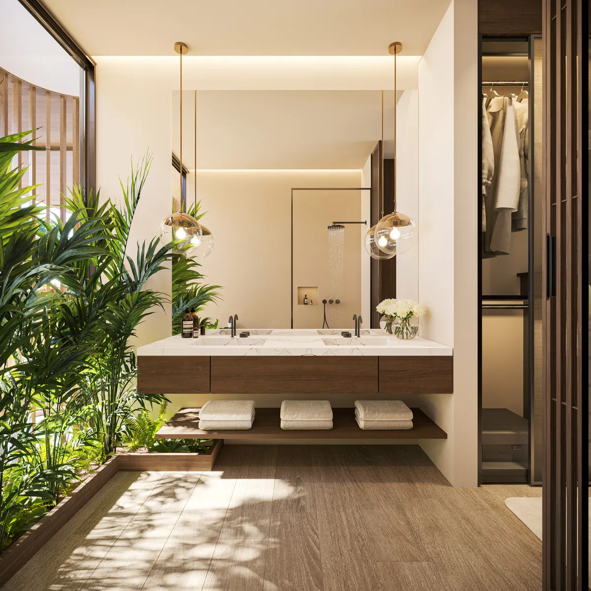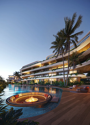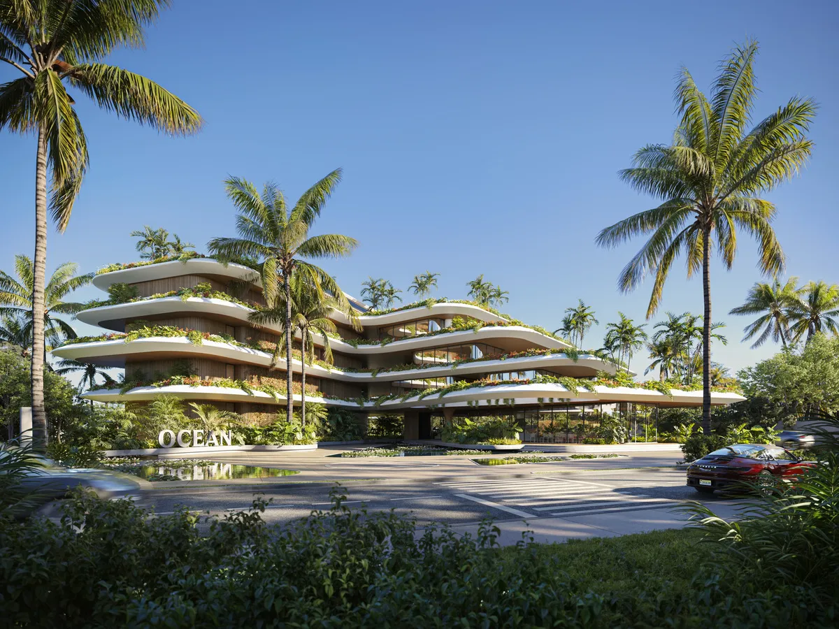 Ocean Residences, proyecto residencial en construcción, ubicado a solo 800 metros de la playa, presenta una fusión armoniosa entre diseño arquitectónico moderno y naturaleza tropical. La fachada ondulada imita el flujo natural del océano, integrándose perfectamente con el entorno de palmeras y vegetación exuberante.
