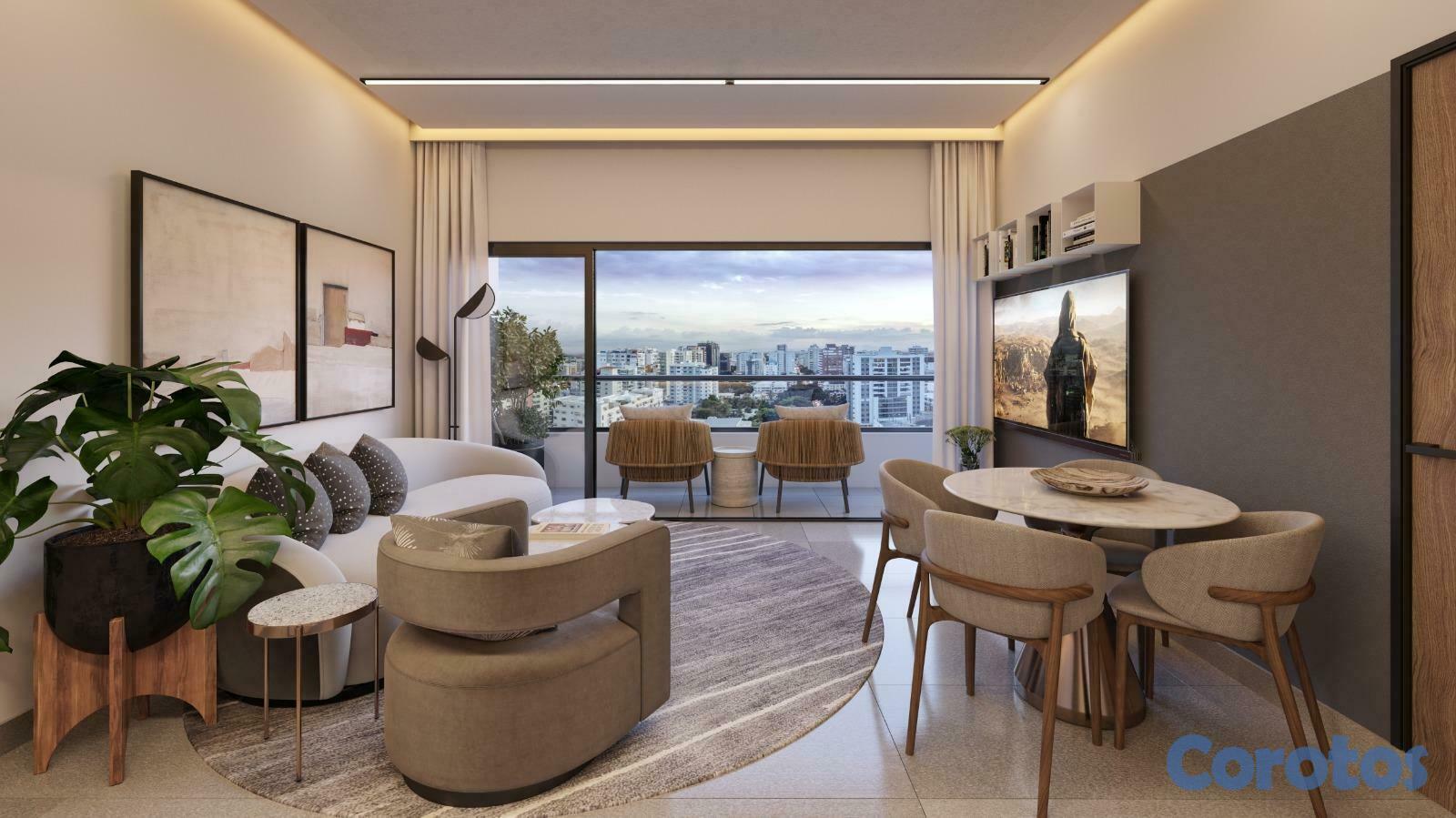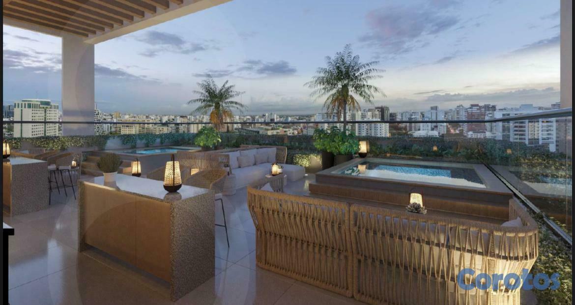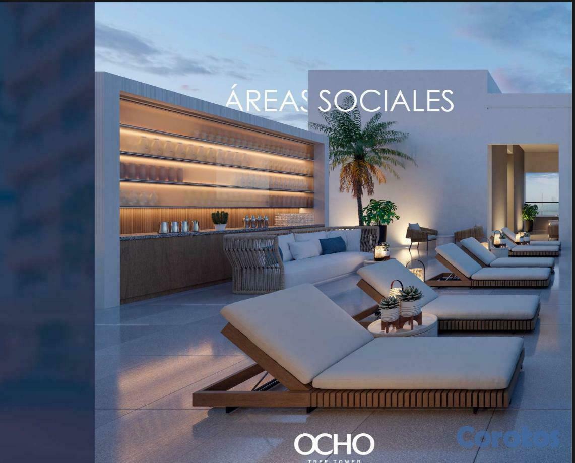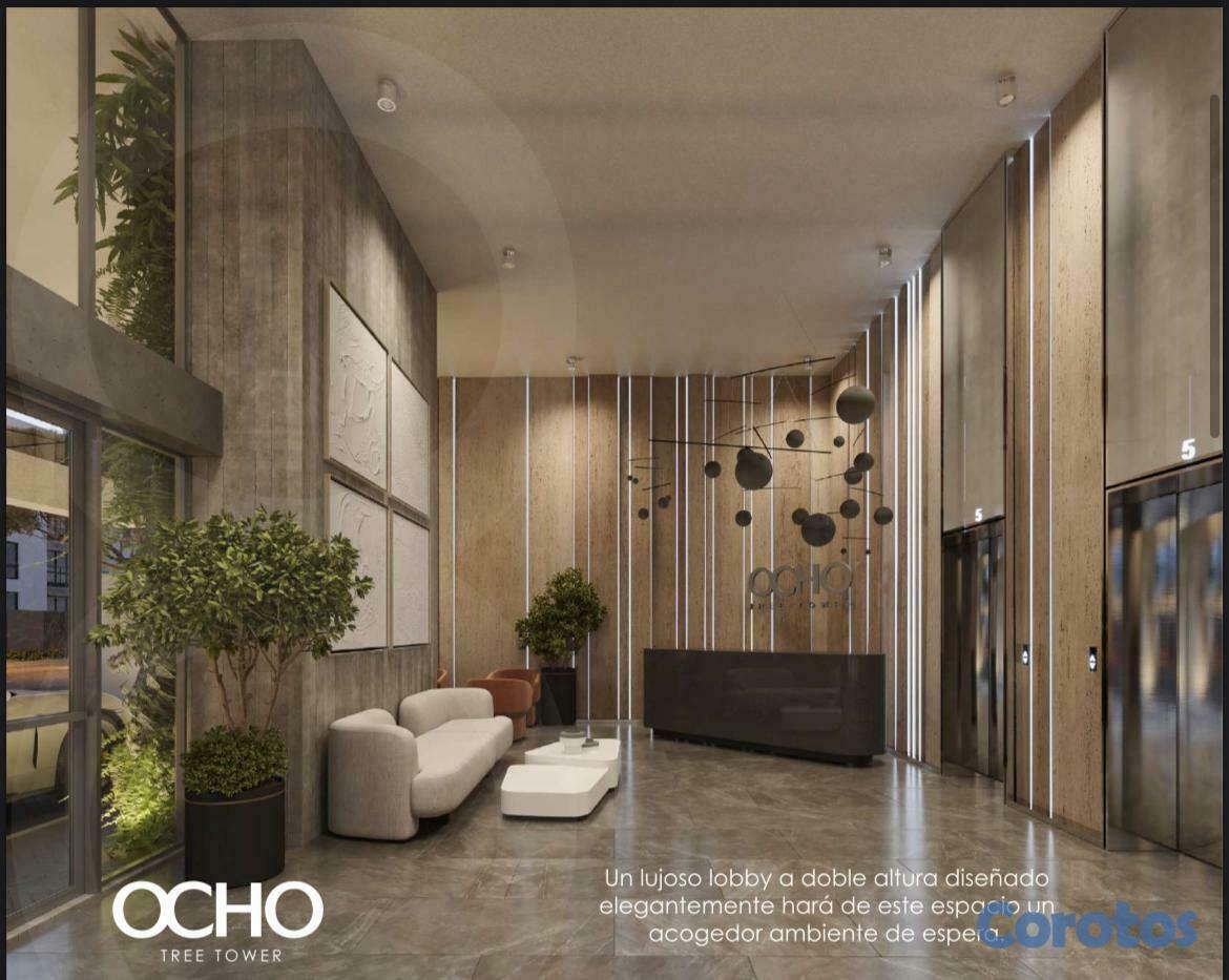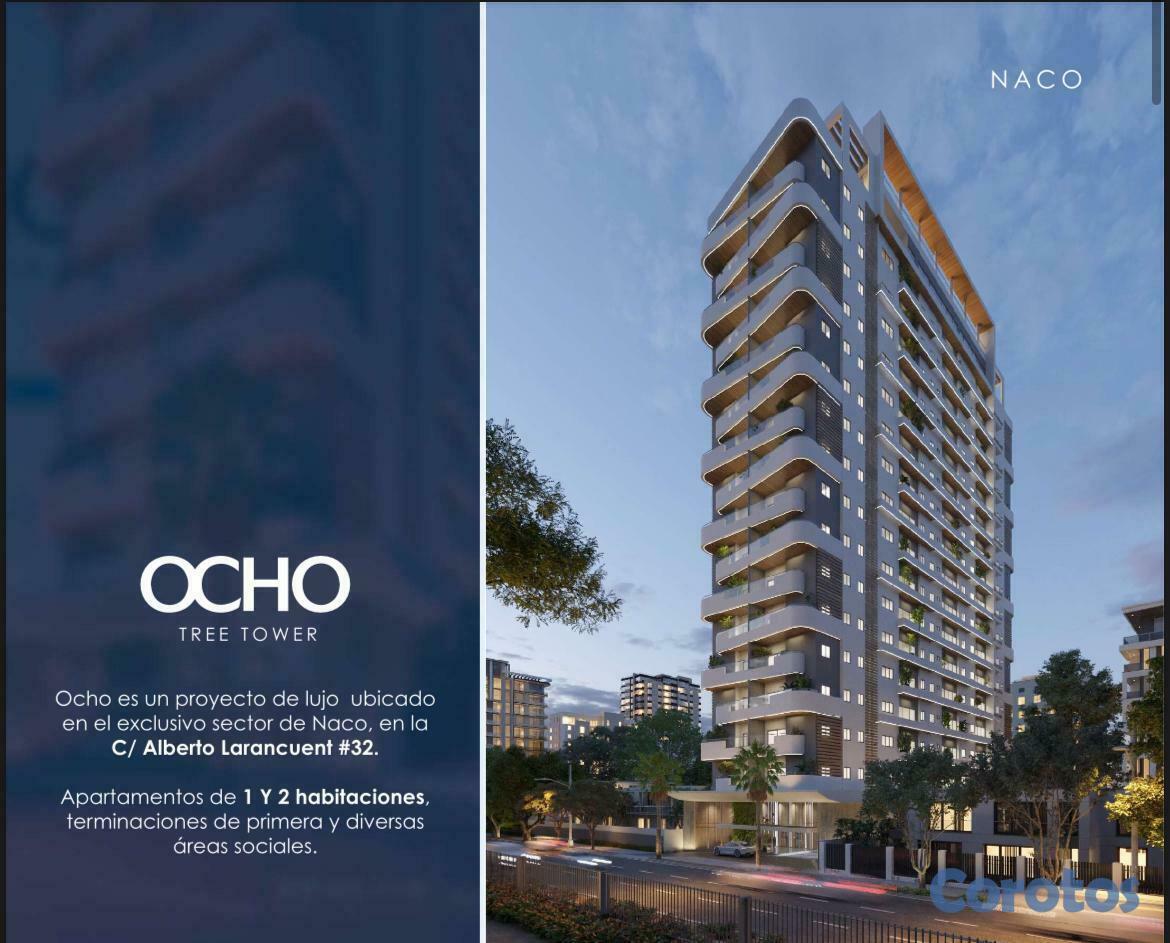 Les presento el proyecto Ocho Tree Tower, diseñado para un estilo de vida moderno. Ubicación ideal y estratégica, en el área más buscada: Naco. Rodeado de avenidads importantes, centros comerciales y zonas de entretenimiento.Lobby de doble altura climatizado y elegante, que da una primera impresión de lujo y comfort. Todo esta armoniosamente pensado para su disfrute y tranquilidad. Apartamentos de 1 y 2 habitaciones. Amenidades.Características Generales:Lobby de lujo climatizado3 ascensoresUn generador eléctricoCircuito cerrado de seguridadSistema de gas comúnSistema contra incendio y pararrayos en Proyecto Ocho Tree TowerCisternaDos bombas para servicio de agua y bomba sumergiblePre-instalación de aire acondicionadoTerminaciones:Revestimientos en baños con cerámicas importadasPisos en porcelanato importado, una característica de Proyecto Ocho Tree TowerAparatos sanitarios importadosPuertas de ingeniería enchapadosCocina modularGrifería importadaFregadero de acero inoxidableTope de cocina de granitoVentanas en aluminio y vidrio importadosCalentadores de agua eléctricosCaracterísticas Apartamentos:– APTOS, Bloque A, C, D y F, 58m2 hasta 70m21 habitación con baño y walk-in closet o closet½ baño para visitasSala/ ComedorBalcón (integrado en Bloque F)Cocina1 parqueo– APTOS, Bloque B, CD y E, 105m2 hasta 120m22 habitaciones con baño, principal con walk-in closet o closet, en Proyecto Ocho Tree TowerHabitación secundaria con closet½ baño para visitasSala/ ComedorEstar (tipo CD)BalcónCocinaÁrea de lavadoHabitación de servicio con baño1 y 2 parqueosÁreas Sociales:Piso 2GimnasioLoungeCo-workingBaños para damas y caballerosPiso 18Piscina infinitaTerraza2 JacuzziPista de caminarBaños para damas y caballeros.