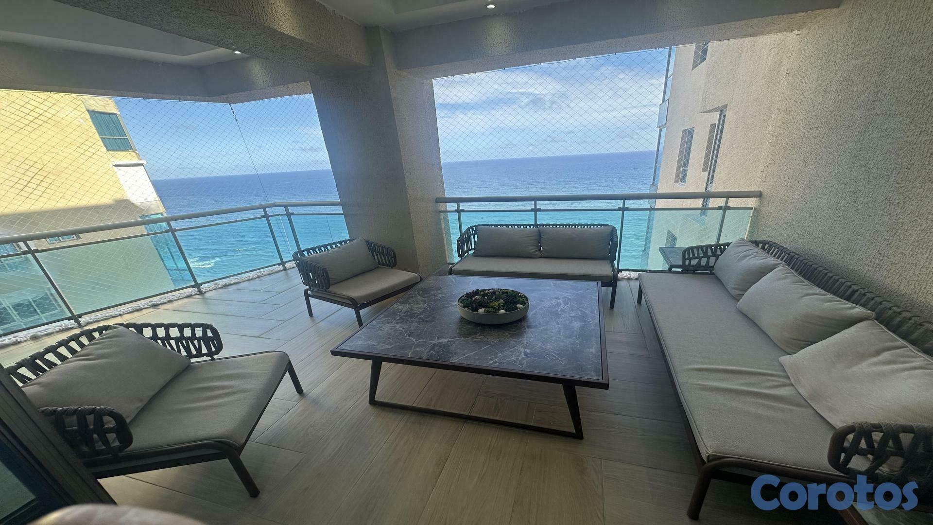 Venta apartamento finamente amueblado de 362metros cuadrados, con vista frente al mar desde una amplia y hermosa terraza. Su frescura y ventilación conjugan un ambiente de relajación y se caracteriza por estar ubicado en un piso alto de una torre majestuosa. Cuenta con las siguientes características:  Características:· 362m2 · Pisos de mármol  · Entrada / recibidor · Amplia terraza tipo L · Sala · Family · Comedor · Amplia cocina con desayunador y todo nuevo · Baño de visita · 3 amplias habitaciones (principal con amplio baño y un amplísimo walk-in closet en madera preciosa) · Habitaciones secundarias cada una con su baño y amplio closet.  · Área de lavado · Cuarto de servicio.  · 2 parqueos paralelos techados  · Entre otras comodidades.   Torre cuenta con: Piscina / Gazebo / BBQ Gimnasio Sala de billar, Salón multiuso Entre otras amenidades  PRECIO AMUEBLADO COMPLETO: US$650,000.00