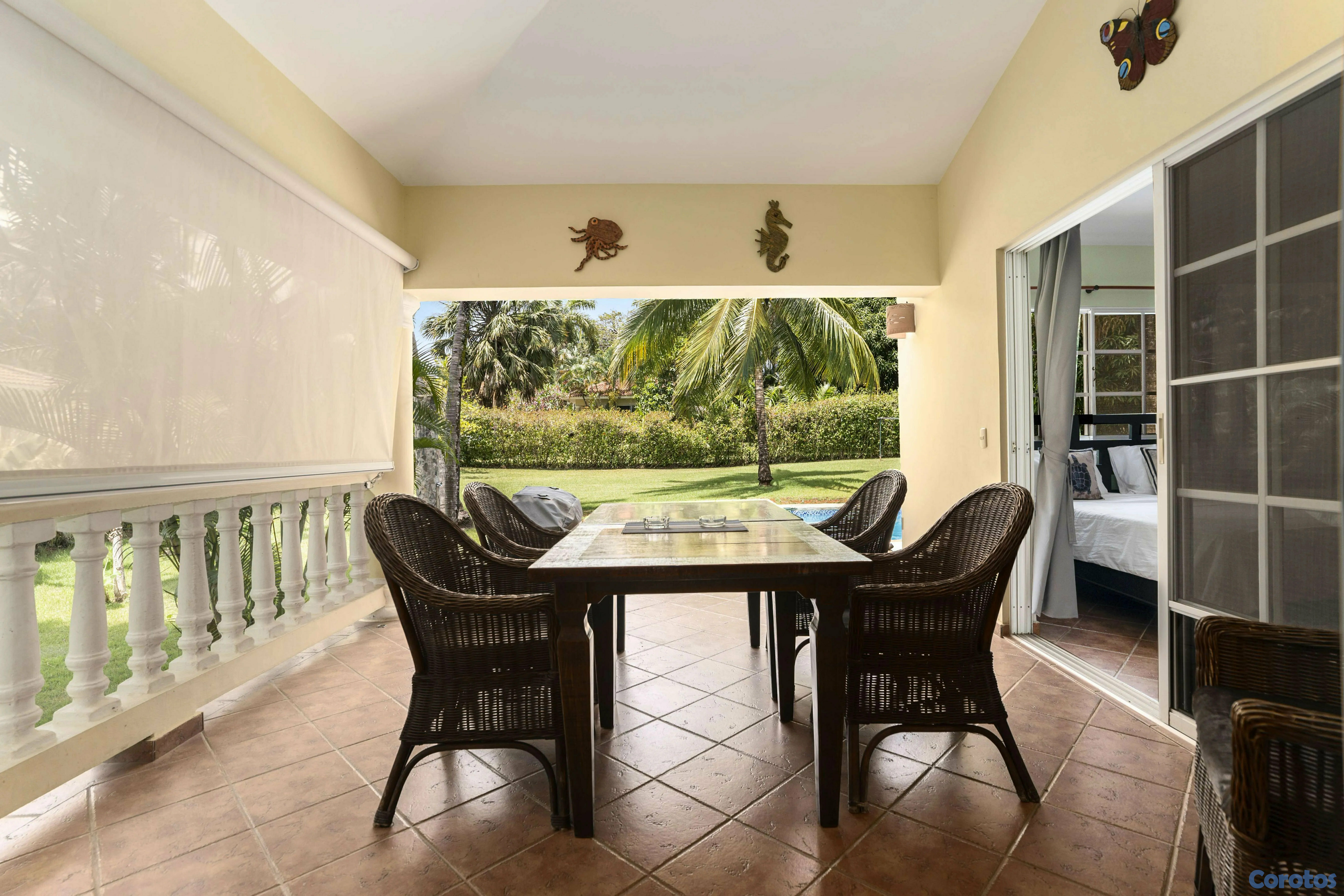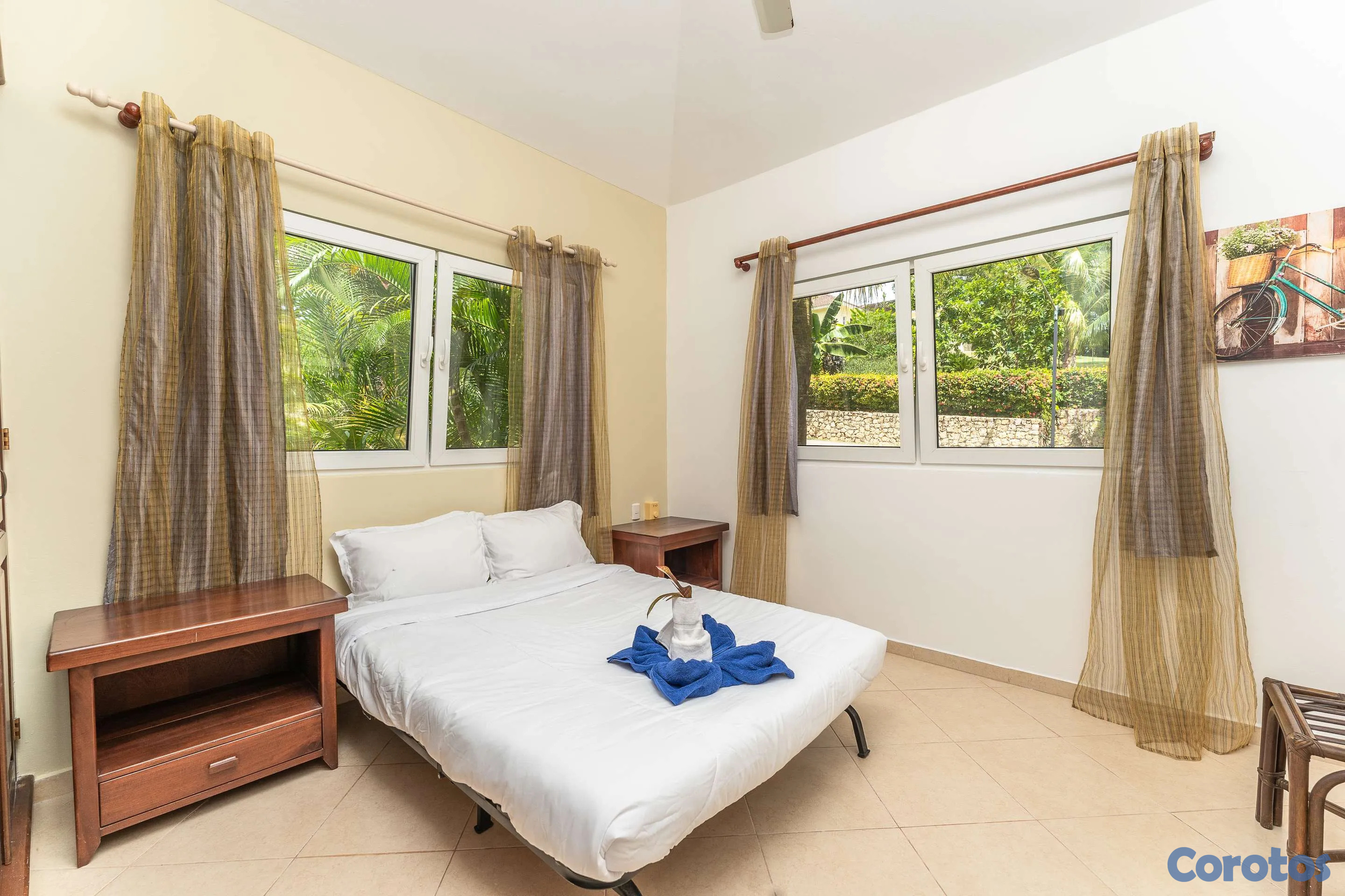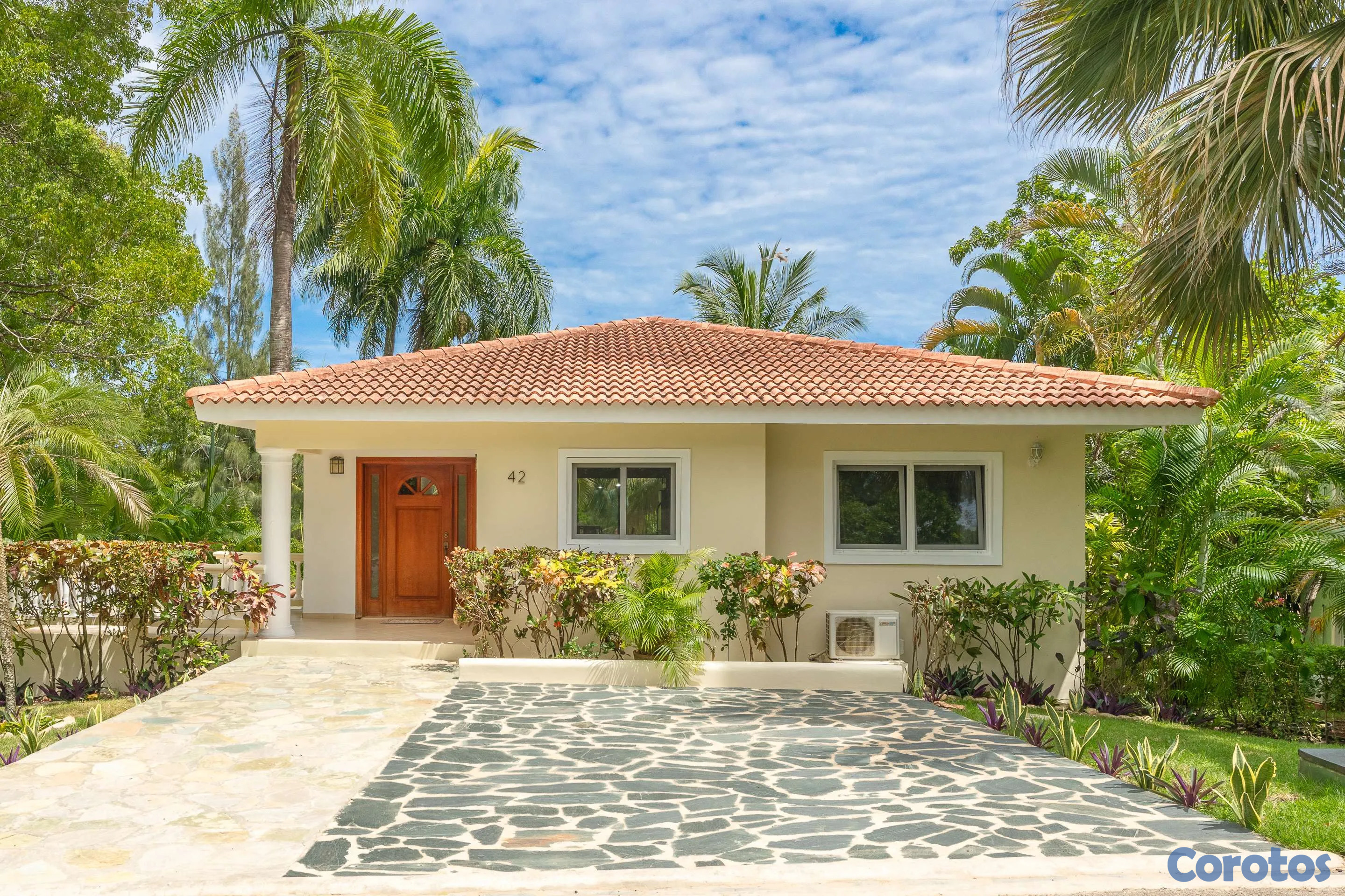 Ubicada cerca de la entrada de Residencial Hispaniola, esta acogedora villa de dos dormitorios es ideal para personas solas, parejas, familias jóvenes o como propiedad de alquiler. Cuenta con cocina y sala de estar con una amplia zona de estar en la terraza cubierta. El dormitorio principal incluye baño en suite y una puerta corredera que da directamente a la terraza. El segundo dormitorio se encuentra cerca del baño principal. Ambos dormitorios cuentan con armarios empotrados, aire acondicionado y ventiladores de techo. La piscina privada y el amplio jardín ofrecen una escapada relajante en un hermoso entorno tropical. Servicios de alquiler y administración disponibles en el lugar. Su pequeña villa en el paraíso