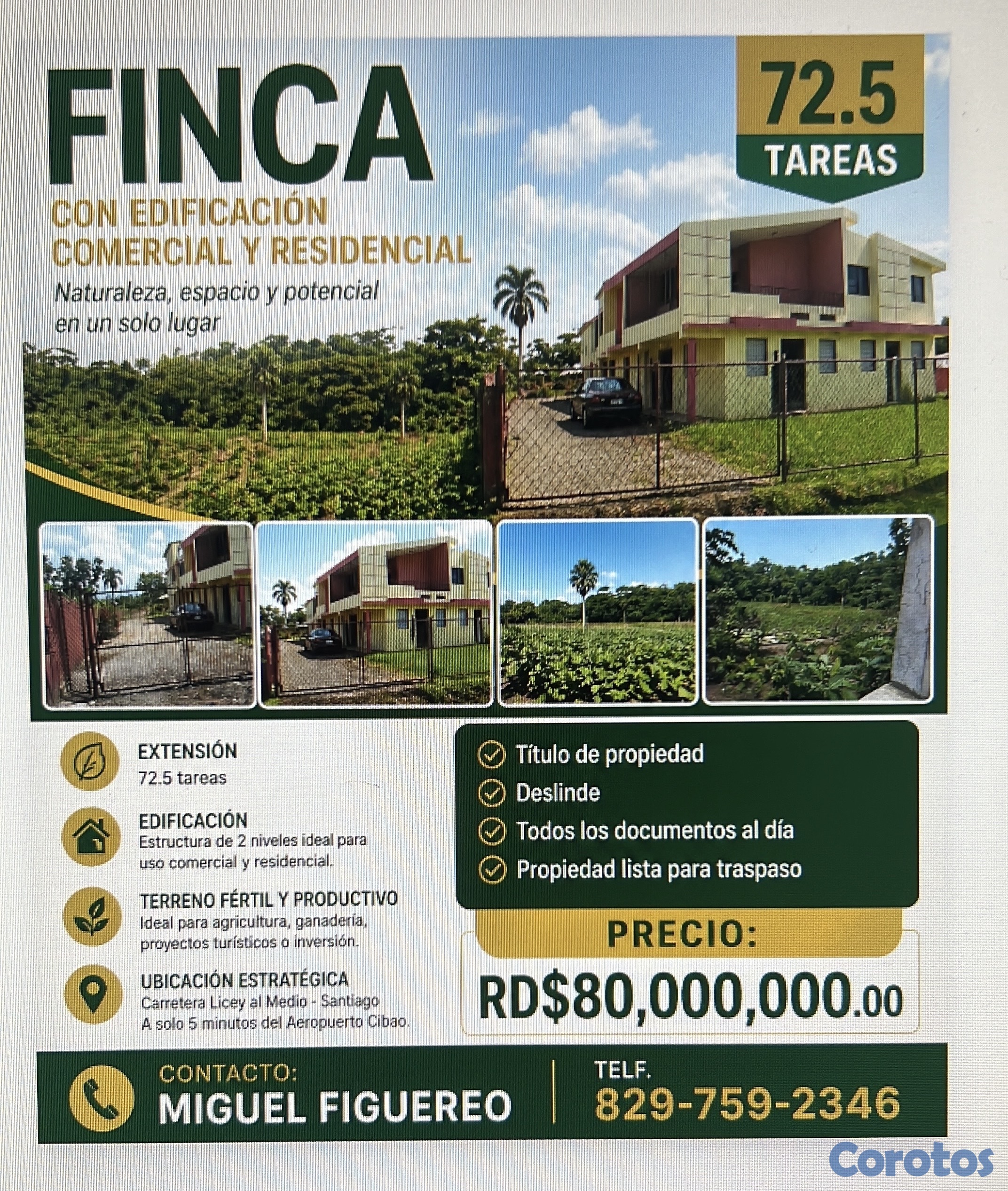 Venta de finca con edificación comercial / residencial 72.5 tareas, con edificación de 2 niveles ideal para comercio o residencia, terreno fértil y productivo. Ubicación estratégica Carretera Licey al Medio, Santiago, a 5 minutos Aeropuerto Cibao.